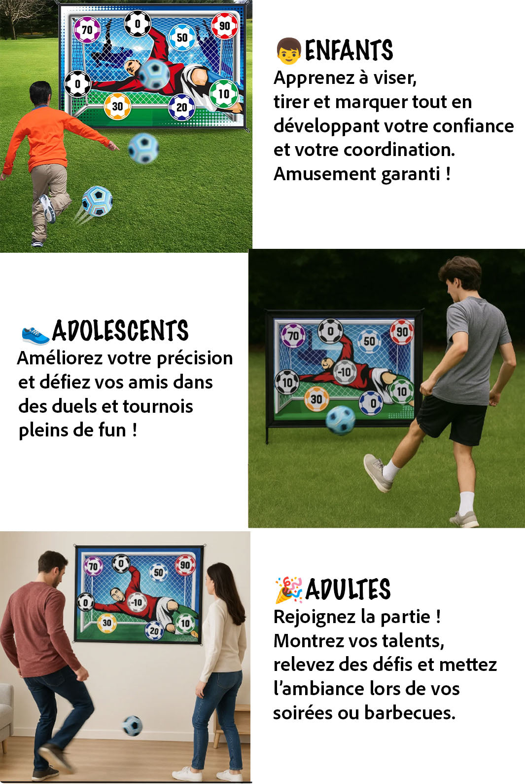 Le ButMagique est un jeu amusant pour tous les âges, des enfants qui veulent améliorer leur précision aux adolescents et aux adultes qui souhaitent affiner leurs compétences ou simplement s'amuser.